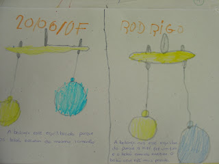 Antes de fazermos experiências com ar já sabiamos muitas coisas, mas depois das experiências ficámos a saber muito mais. Por exemplo, o Peso. Só dois meninos acharam que o ar tinha peso, mas depois de construirmos a balança verificámos que, afinal o ar tem peso.